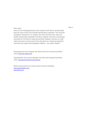 Smart ist zum 11. Mal Partner der Wahl zum Champion des Jahres, die vom 22. bis 29. September 2010 in Portugal stattfindet. Bei diesem Event wird der Sieger mit einem smart fortwo cabrio ausgezeichnet, während die anderen nominierten Teilnehmer ein smart fortwo für sechs Monate erhalten. Darüber hinaus engagiert sich Smart in den Sportarten Beachvolleyball und Running als Titelsponsor und Partner, um Sportler zu unterstützen und die eigene Marke zu fördern.