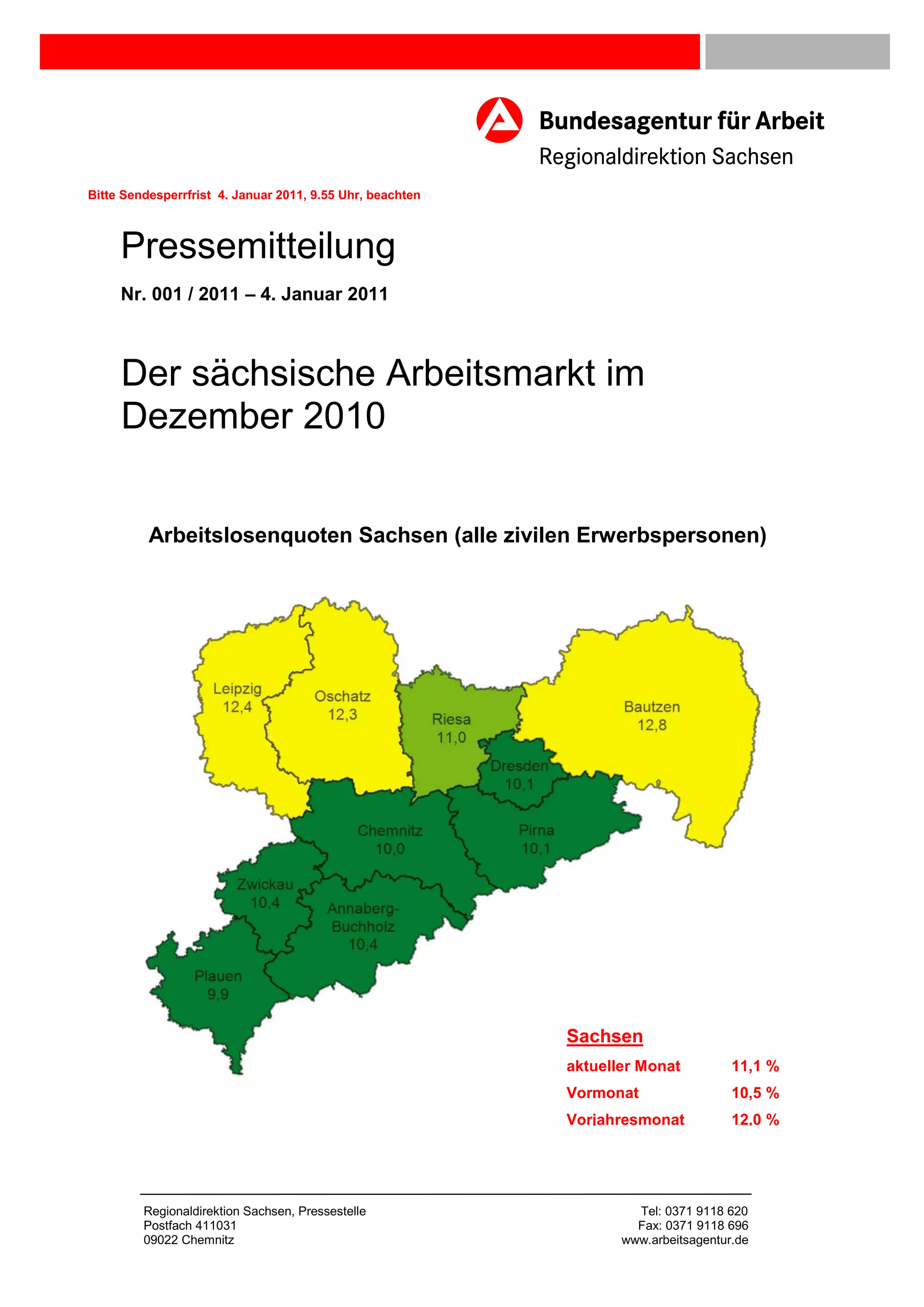 Im Dezember 2010 stieg die Arbeitslosenquote in Sachsen auf 11,1 % mit 236.917 Arbeitslosen, was einem Anstieg von 6,2 % im Vergleich zum Vormonat entspricht, während die Zahl der Arbeitslosen im Vergleich zum Vorjahr um 8 % reduziert wurde. Ursachen für den Anstieg sind witterungsbedingte Arbeitsausfälle, insbesondere in der Landwirtschaft und im Baugewerbe. Trotz des Anstiegs hat Sachsen die geringste Dezember-Arbeitslosigkeit seit 1991 und verzeichnet ein Plus an sozialversicherungspflichtiger Beschäftigung und steigende Arbeitskräftenachfrage.