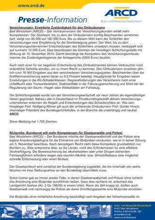 Die Presseinformation des ARCD vom 17. November 2010 behandelt mehrere Themen, darunter die Genehmigung privater Wildwarnreflektoren in Bayern zur Reduzierung von Wildunfällen, die Erweiterung der Zuständigkeiten des Ombudsmanns für Versicherungsangelegenheiten und geplante Änderungen der Blutprobenentnahme durch Staatsanwälte und Polizei. Zudem wird auf einen leichten Anstieg der medizinisch-psychologischen Untersuchungen im Jahr 2009 hingewiesen, während es Kritiken an den Anordnungen gibt. Der ARCD fordert eine höhere Verantwortung der Straßenbehörden in Bezug auf die Wildwarnreflektoren und kritisiert die private Regulierung.