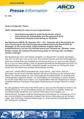 Der ARCD kritisiert die neue PKW-Energieverbrauchskennzeichnung in Deutschland, da große Fahrzeuge leicht bessere Effizienzbewertungen erhalten können, was Anreize für umweltfreundliche Autoentwicklungen verringert. Die Kennzeichnung, die ab dem 1. Dezember 2011 gilt, enthält eine Farbskala und erfordert, dass Händler die Effizienzwerte sichtbar an Neuwagen anbringen. Trotz der Kritik wird anerkannt, dass das Ökolabel einen positiven Schritt zur Steigerung des Umweltbewusstseins der Verbraucher darstellt.