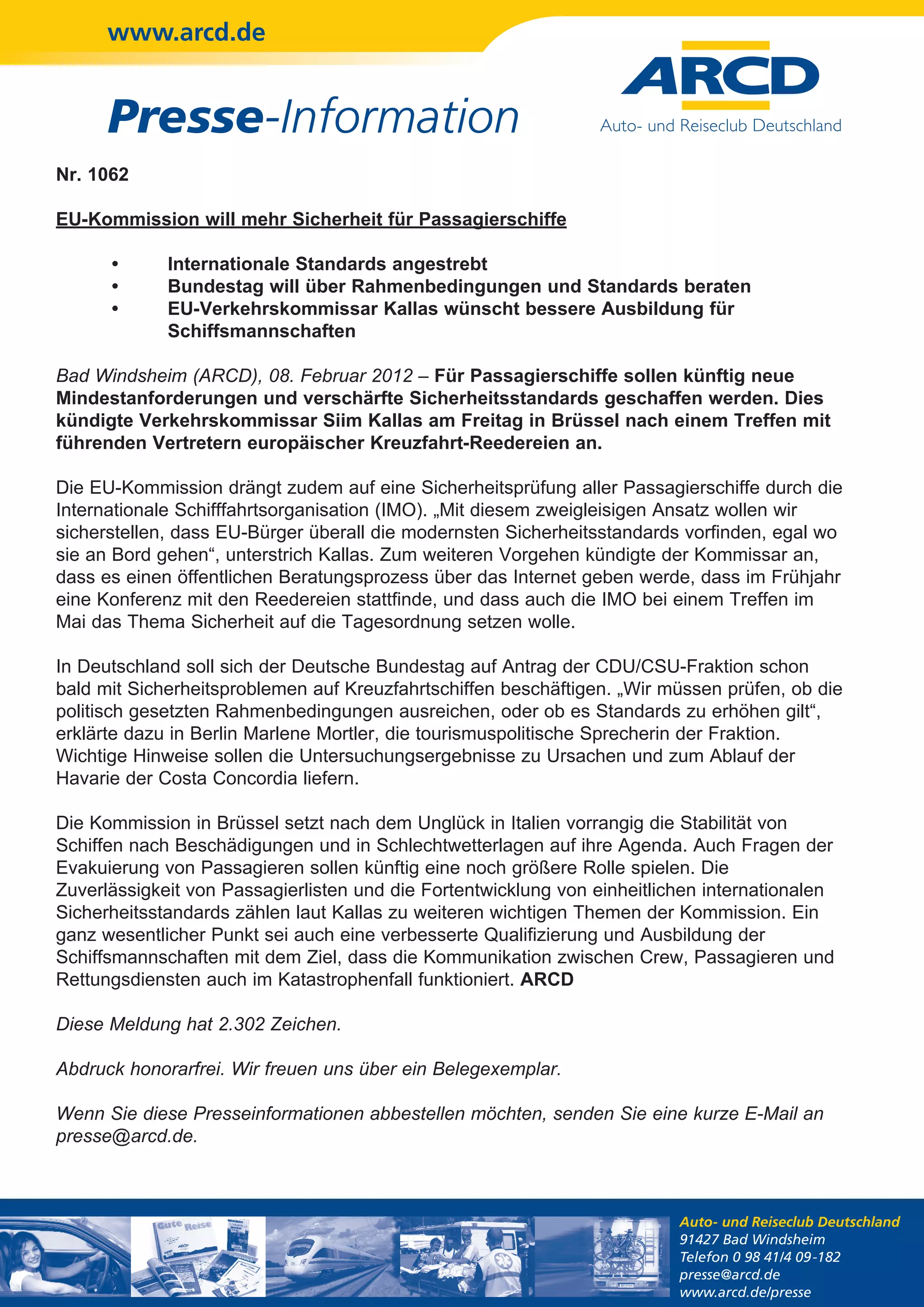 Die EU-Kommission plant, neue Mindestanforderungen und verschärfte Sicherheitsstandards für Passagierschiffe einzuführen, um die Sicherheit der EU-Bürger zu gewährleisten. Verkehrskommissar Siim Kallas betont die Notwendigkeit einer verbesserten Ausbildung der Schiffsbesatzungen und kündigt einen öffentlichen Beratungsprozess an sowie eine Konferenz mit Reedereien über Sicherheitsfragen. In Deutschland will der Bundestag die Sicherheitsprobleme auf Kreuzfahrtschiffen prüfen, insbesondere nach dem Unglück der Costa Concordia.