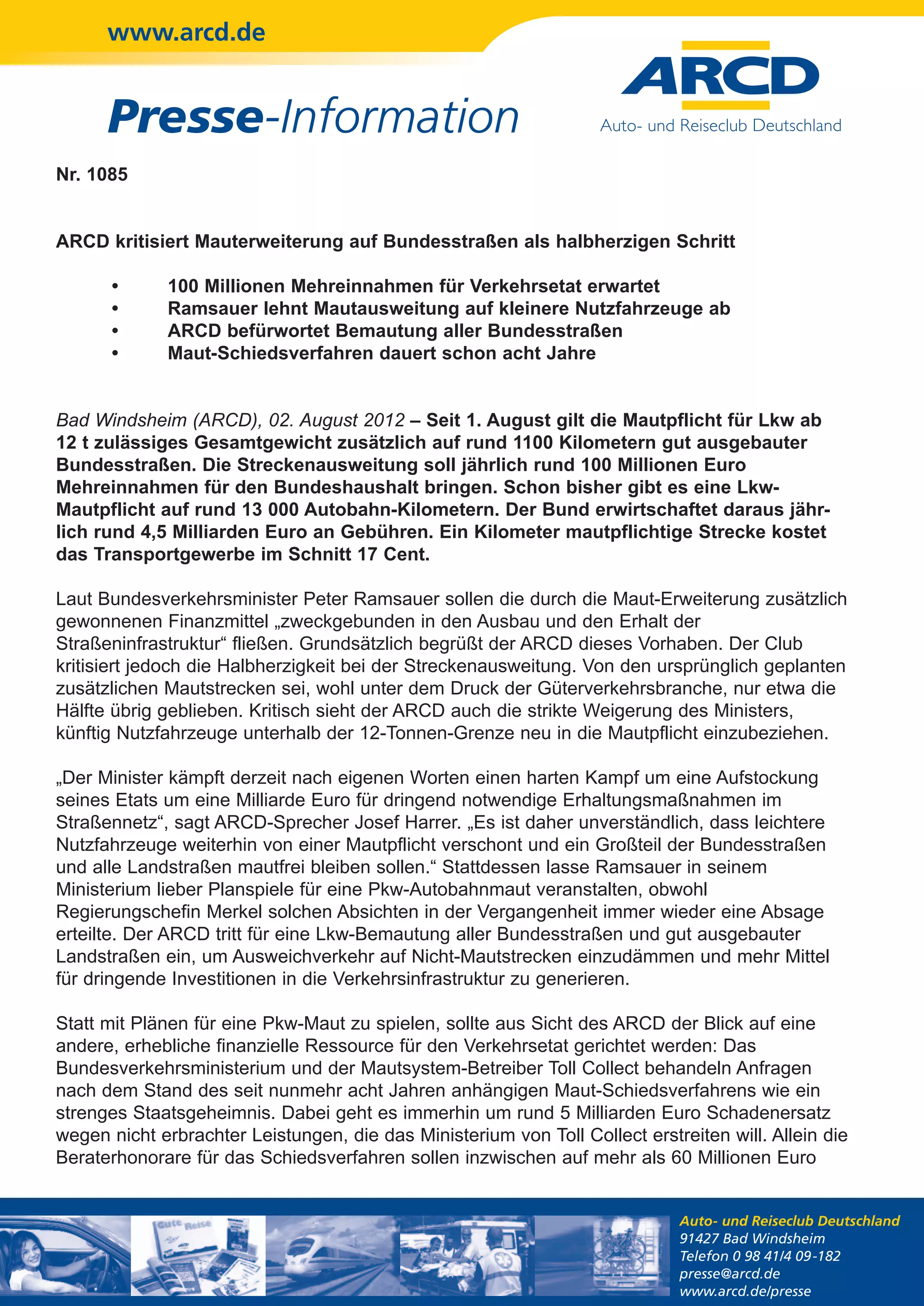 Der ARCD kritisiert die angekündigte Mauterweiterung auf Bundesstraßen als unzureichend und fordert die Bemautung aller Straßen zur Eindämmung des Ausweichverkehrs sowie zur Generierung zusätzlicher Mittel für die Verkehrsinfrastruktur. Verkehrsminister Ramsauer lehnt eine Mautpflicht für leichtere Nutzfahrzeuge ab, was laut ARCD die notwendigen Investitionen in die Straßeninfrastruktur behindert. Zudem gibt es seit Jahren unveröffentlichte Informationen zum langersehnten Maut-Schiedsverfahren, bei dem es um rund 5 Milliarden Euro Schadenersatz geht.