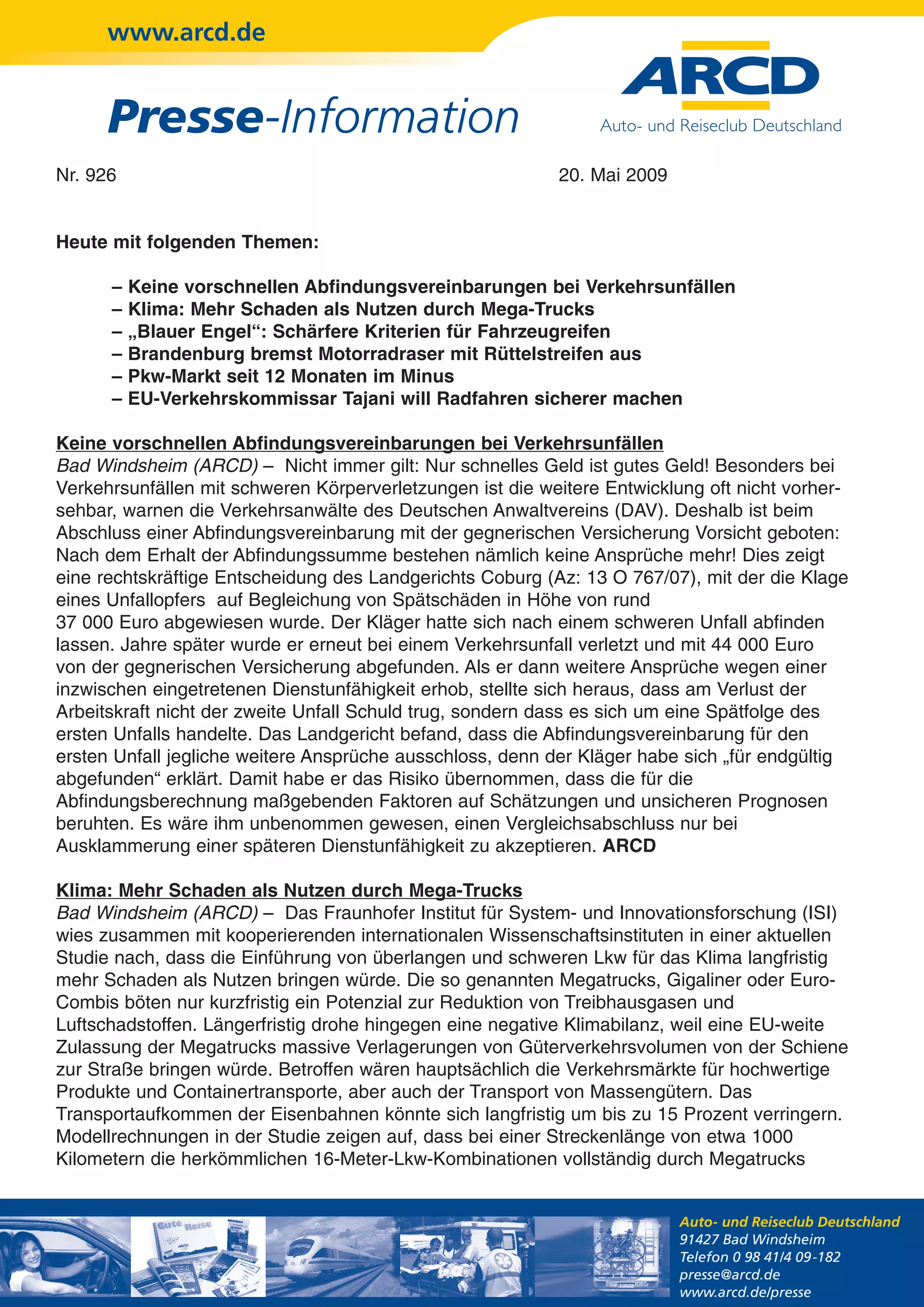 Die Presseinformation des ARCD vom 20. Mai 2009 behandelt verschiedene Verkehrs- und Umweltthemen, darunter Warnungen vor vorschnellen Abfindungsvereinbarungen nach Verkehrsunfällen und die negativen Klimaauswirkungen von Mega-Trucks. Weiterhin wird über schärfere Kriterien für den Umweltstandard 'Blauer Engel' bei Fahrzeugreifen berichtet, während Brandenburg Maßnahmen zur Reduzierung von Motorradunfällen einführt. Der PKW-Markt in Europa bleibt seit 12 Monaten im Minus, während EU-Verkehrskommissar Tajani die Sicherheit von Radfahrern fördern möchte.