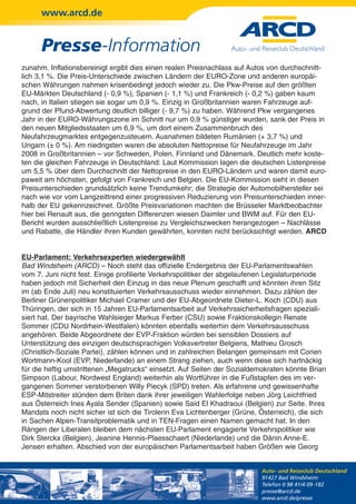 Die EU hat eine neue Verordnung verabschiedet, die ab dem 1. Juli 2009 die Roaming-Gebühren für mobile Telefonate im Ausland erheblich senkt, womit Verbraucher im EU-Ausland weniger als die Hälfte der bisherigen SMS-Kosten zahlen und Anrufe Sekundengenau abgerechnet werden müssen. Der Preis für PKWs ist in der EU insgesamt um 3,1 % gefallen, während Deutschland die höchsten PK-Preise aufweist, trotz eines leichten Rückgangs. Bei den Wahlen zum EU-Parlament wurden verschiedene Verkehrsexperten wiedergewählt, wobei einige bekannte Politiker weiterhin in den Verkehrsausschüssen vertreten sein werden.