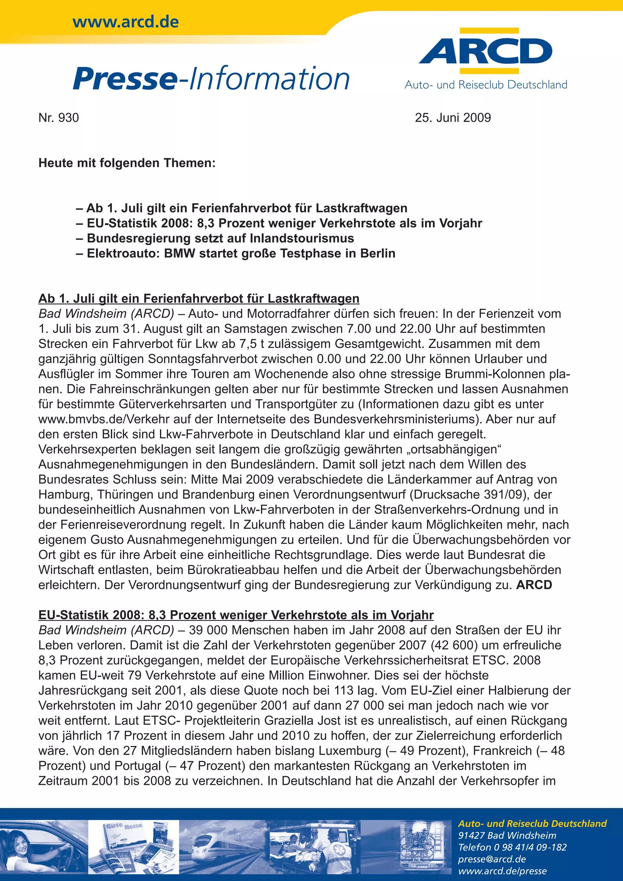 Ab dem 1. Juli 2009 gilt ein Fahrverbot für Lkw über 7,5 Tonnen an Samstagen während der Ferienzeit in Deutschland, um Urlaubsreisen zu erleichtern. Die EU verzeichnete 2008 einen Rückgang der Verkehrstoten um 8,3 Prozent, und es wird auf die Notwendigkeit hingewiesen, den Inlandstourismus zu fördern, insbesondere in den ostdeutschen Regionen. BMW startet einen großen Feldversuch mit Elektroautos in Berlin, unterstützt von der Bundesregierung mit 500 Millionen Euro für die Entwicklung der Elektromobilität.