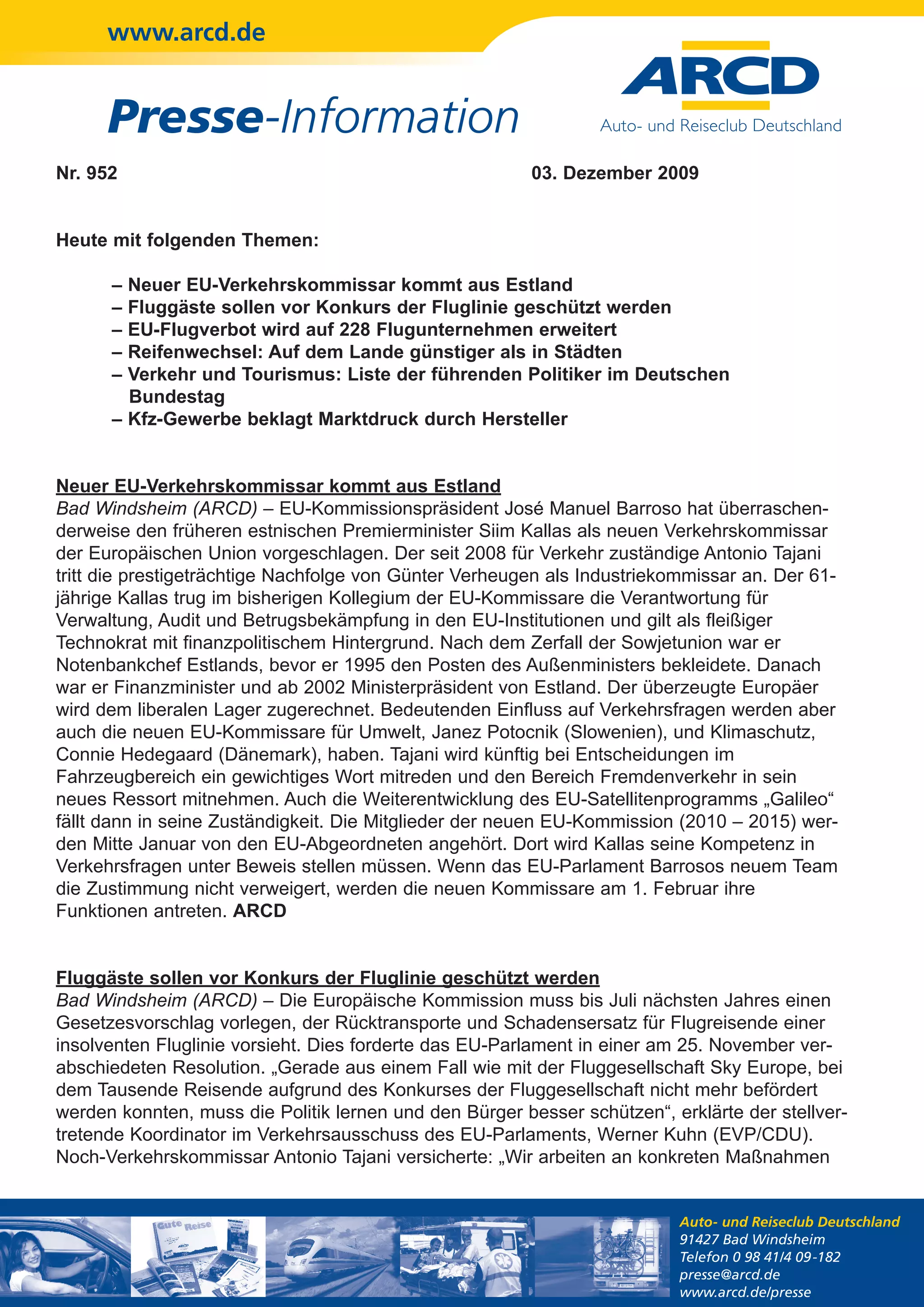 Die Presseinformation des ARCD vom 3. Dezember 2009 thematisiert unter anderem die Nominierung des estnischen Politikers Siim Kallas als neuen EU-Verkehrskommissar, bevorstehende gesetzliche Regelungen zum Schutz von Fluggästen im Insolvenzfall von Airlines sowie die Erweiterung des EU-Flugverbots auf 228 Fluggesellschaften. Des Weiteren wird der Kostenvorteil für Reifenwechsel auf dem Land im Vergleich zur Stadt thematisiert. Abschließend wird der Druck auf das Kfz-Gewerbe aufgrund eines neuen Geschäftsmodells und der Notwendigkeit zur Anpassung an Marktveränderungen hervorgehoben.
