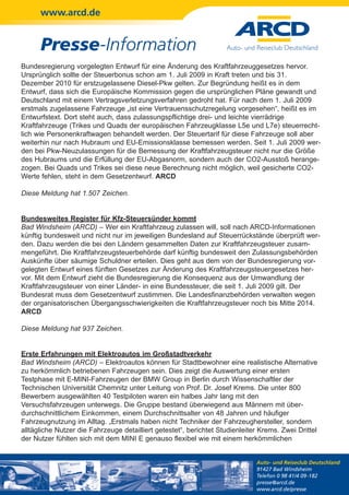 Die Pressemitteilung des ARCD vom 25. Februar 2010 behandelt mehrere Themen, darunter die Sicherheitslücken bei Autoschlüsseln, eine verzögerte Steuerbefreiung für Diesel-Pkw mit Euro 6, die Einführung eines bundesweiten Registers für Kfz-Steuersünder sowie erste Erfahrungen mit Elektroautos im Stadtverkehr. Zudem wird die Gründung einer Generaldirektion für 'Mobilität und Verkehr' in der EU-Kommission sowie ein Appell für mehr Verkehrssicherheit durch definierte EU-Ziele thematisiert. Insgesamt fordert der ARCD eine stärkere Verantwortung und Maßnahmen zur Verbesserung der Verkehrssicherheit und technischen Standards in der Automobilbranche.