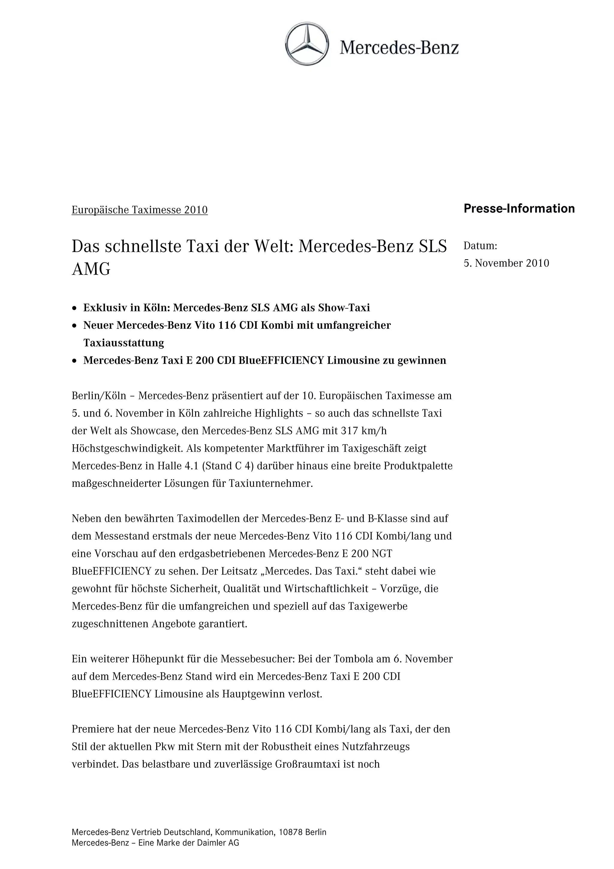 Auf der 10. europäischen Taximesse in Köln präsentiert Mercedes-Benz am 5. und 6. November 2010 den schnellsten Taxi der Welt, den Mercedes-Benz SLS AMG, sowie eine breite Produktpalette an taxitauglichen Fahrzeugen wie den neuen Vito 116 CDI Kombi. Zu den Highlights zählen auch die Verlosung einer E 200 CDI BlueEfficiency Limousine und spezielle Dienstleistungsangebote für Taxiunternehmer. Mercedes-Benz betont mit dem Leitsatz 'Mercedes. Das Taxi.' die Sicherheit, Qualität und Wirtschaftlichkeit seiner Produkte.