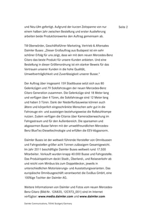 Budapest hat die größte Bestellung von 159 neuen Mercedes-Benz Citaro Stadtbussen aufgegeben, die ab April 2013 ausgeliefert werden. Die Flotte umfasst sowohl Gelenkzüge als auch Solofahrzeuge, die umweltfreundliche Bluetec-Dieseltechnologie nutzen und die EEV-Abgasnorm erfüllen. Daimler Buses hebt hervor, dass dieser Großauftrag das Vertrauen der Kunden in die Qualität und Zuverlässigkeit ihrer Produkte widerspiegelt.