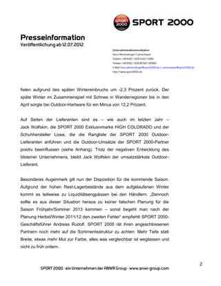 Sport 2000 verzeichnete im ersten Halbjahr 2012 ein Umsatzwachstum von 7,5 Prozent, wobei der Outdoor-Bereich stabil blieb, trotz eines leichten Umsatzrückgangs bei Outdoor-Textilien. Die Organisation betont die Notwendigkeit einer stärkeren Zusammenarbeit mit Lieferanten und empfiehlt eine Anpassung der Bestellstrategien, um Liquiditätsengpässe zu vermeiden. Zudem wurde die Nachhaltigkeitsinitiative 'green & fair' gestartet, um das Umweltbewusstsein im Einzelhandel zu fördern.
