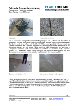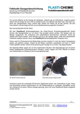 Die Fallstudie beschreibt die Sanierung einer Doppelgarage mit dem Plastifloor®-Bodenbelagssystem von Plasti-Chemie, die in nur 8 Stunden abgeschlossen werden konnte, einschließlich der Vorbereitungen und des Einbaus. Der Prozess umfasst das Entfernen des alten Bodens, das Ausbessern von Rissen und Unebenheiten sowie das Auftragen mehrerer Schichten für eine strapazierfähige und rutschfeste Oberfläche. Das Ergebnis ist ein schnell belastbarer Garageboden, der in verschiedenen Farben und Rutschfestigkeitsklassen erhältlich ist.