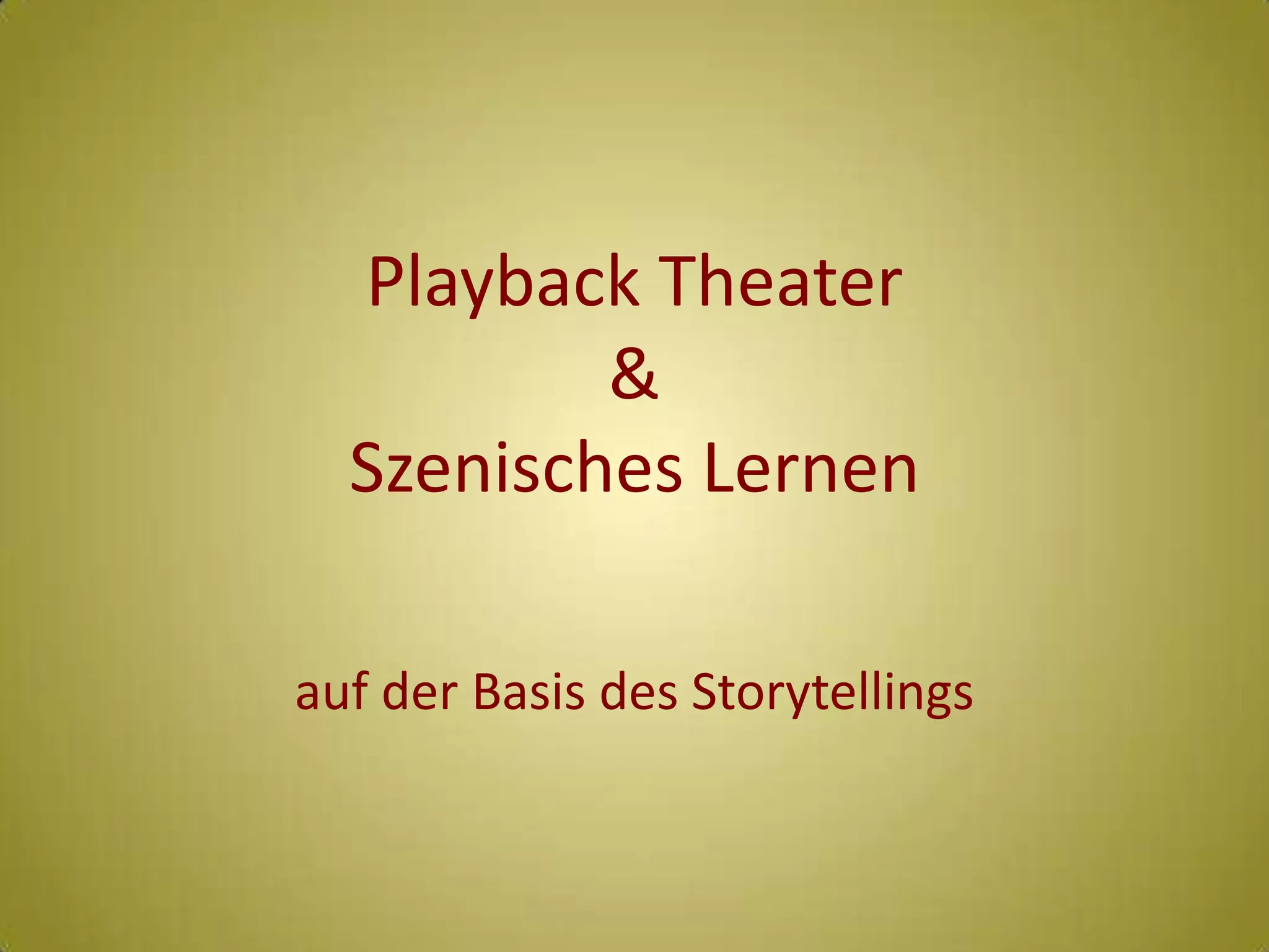 Das Dokument behandelt die Bedeutung von Playback-Theater und szenischem Lernen durch Storytelling. Es wird erläutert, wie Geschichten unser Leben strukturieren und wie individuelle und kollektive Narrative entstehen, sich verändern und miteinander verbunden sind. In diesen Erzählungen übernehmen Menschen verschiedene Rollen und schaffen Szenen, die sowohl repräsentativ als auch transformativ sind.