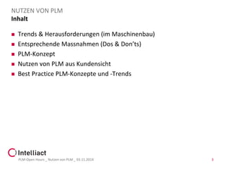 Das Dokument behandelt die Nutzung von Product Lifecycle Management (PLM) im deutschen Maschinenbau und identifiziert Trends und Herausforderungen wie Standardisierung und Modularisierung sowie die Herausforderungen der internationalen Zusammenarbeit. PLM wird als Schlüssel für die Effizienzsteigerung, Produktqualität und Kostenanalyse dargestellt, während Best Practices vorgestellt werden, um den Nutzen in diesen Bereichen zu maximieren. Die Autoren argumentieren, dass PLM Lösungen bietet, die den Nutzern direkten Nutzen bringen und auf zukünftige Herausforderungen vorbereitet sind.