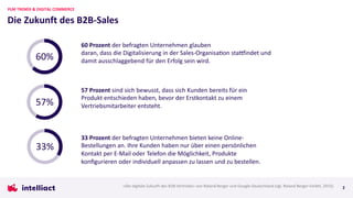 Die Studie von Intelliact zeigt, dass 60% der Unternehmen die Digitalisierung im Vertrieb für entscheidend halten, während 33% keine Online-Bestellungen anbieten. Die Präsentation diskutiert die 'Smart Sales Journey', die die Kundenreise von der Produktauswahl bis zur Konfiguration umfasst und betont die Notwendigkeit einer effizienten Datenvernetzung und Visualisierung im Produktlebenszyklus. Es wird deutlich, dass die Integration von flexiblen Architekturen und Werkzeugen erforderlich ist, um den B2B-Vertrieb zu optimieren.