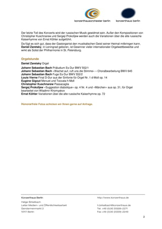Am 15. Mai 2010 findet im Konzerthaus Berlin eine Orgelstunde mit dem Gastorganisten Daniel Zaretsky aus St. Petersburg statt. Das Programm umfasst Werke von Johann Sebastian Bach sowie Kompositionen von Louis Vierne, Eugène Gigout und russischen Komponisten. Zaretsky, der viele internationale Orgelwettbewerbe gewonnen hat, wird dabei die musikalische Tradition seiner Heimat präsentieren.