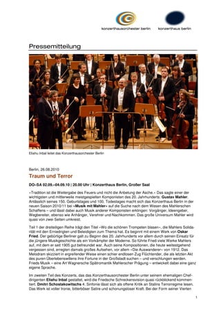 Das Konzerthaus Berlin feiert Gustav Mahler anlässlich seines 150. Geburtstags mit der Konzertreihe "Musik mit Mahler", die vom ehemaligen Chefdirigenten Eliahu Inbal geleitet wird. Teil 1, "Wo die schönen Trompeten blasen", untersucht das Thema der Solidarität und beinhaltet Werke von Oskar Fried und Dmitri Schostakowitsch, die beide auf unterschiedliche Weise die Schrecken ihrer Zeiten thematisieren. Besonders Schostakowitschs 4. Sinfonie wird als kritische Reflexion auf Stalins Terrorregime interpretiert und thematisch mit Mahler verwoben.