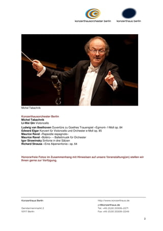 Der Cellist Li-Wei Qin tritt am 9. und 10. September 2011 im Konzerthaus Berlin mit dem Konzerthausorchester unter der Leitung von Michel Tabachnik auf. Auf dem Programm stehen Elgars Cellokonzert, Ravels 'Rapsodie espagnole' und 'Boléro', sowie Beethovens 'Egmont'-Ouvertüre. Li-Wei Qin, Preisträger prestigeträchtiger Wettbewerbe, wird für seine außergewöhnliche Technik und Klanggewalt gelobt.