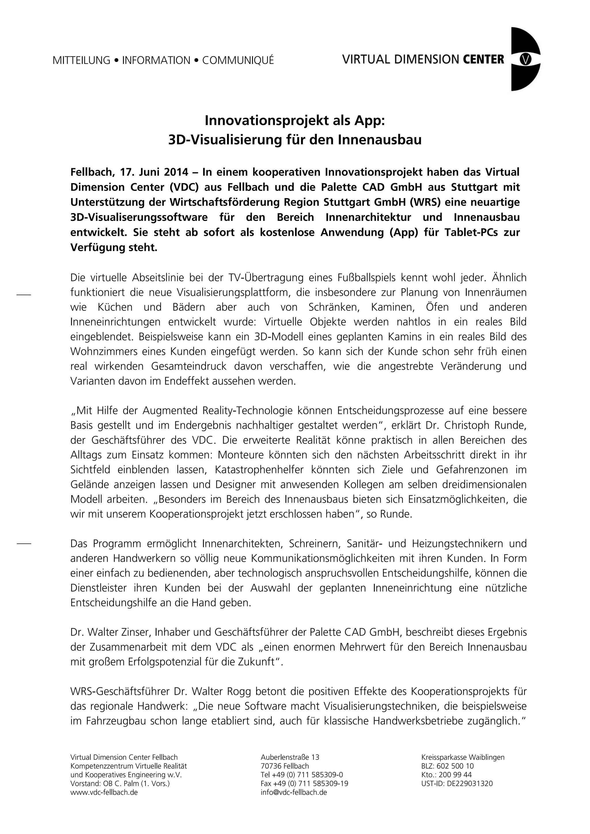 Das Virtual Dimension Center (VDC) Fellbach hat in Zusammenarbeit mit der Palette CAD GmbH eine kostenlose 3D-Visualisierungssoftware für den Innenausbau entwickelt, die Augmented Reality-Technologie nutzt, um virtuelle Objekte in reale Bilder einzublenden. Diese Anwendung ermöglicht Innenarchitekten und Handwerkern eine verbesserte Kommunikation mit Kunden und unterstützt Entscheidungsprozesse bei der Planung von Innenräumen. Die Software steht ab sofort im Google Play Store zur Verfügung und bietet eine innovative Lösung für den klassischen Innenausbau.