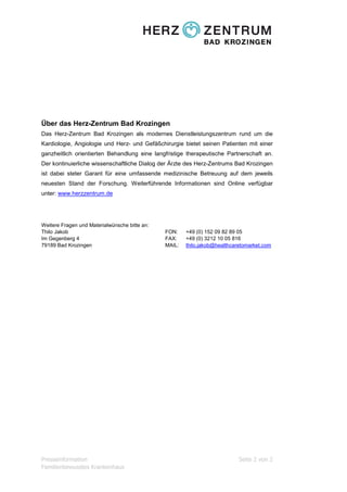 Das Herz-Zentrum Bad Krozingen wurde als familienbewusstes Krankenhaus zertifiziert, was die Vereinbarkeit von Beruf und Familie unterstützt. Im Rahmen des Audits wurden 26 Ziele und 58 Maßnahmen definiert, die unter anderem flexible Arbeitszeiten und eine bessere Kinderbetreuung umfassen. Ziel ist es, Mitarbeiter mit Kindern und pflegebedürftigen Angehörigen zu entlasten und die Attraktivität für potenzielle Bewerber zu erhöhen.