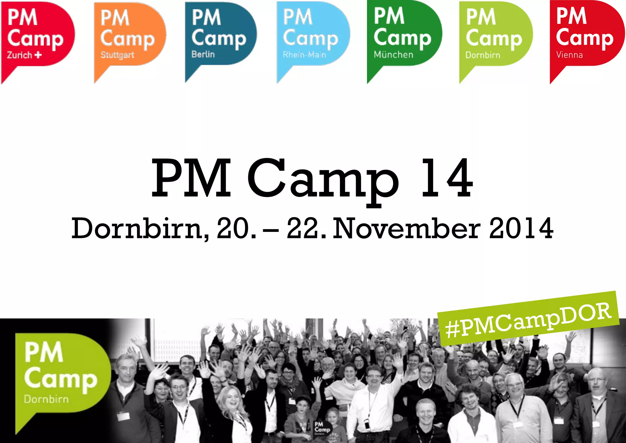 Das PM Camp 14 fand vom 20. bis 22. November 2014 in Dornbirn statt und hatte das Motto 'Beyond Project Management'. Es brachte Menschen auf Augenhöhe zusammen, um gemeinsam zu lernen und die Zukunft des Projektmanagements zu gestalten. Das Format beinhaltete Barcamp-Sessions und Impulsvorträge, um den Austausch zwischen den Teilnehmern zu fördern.