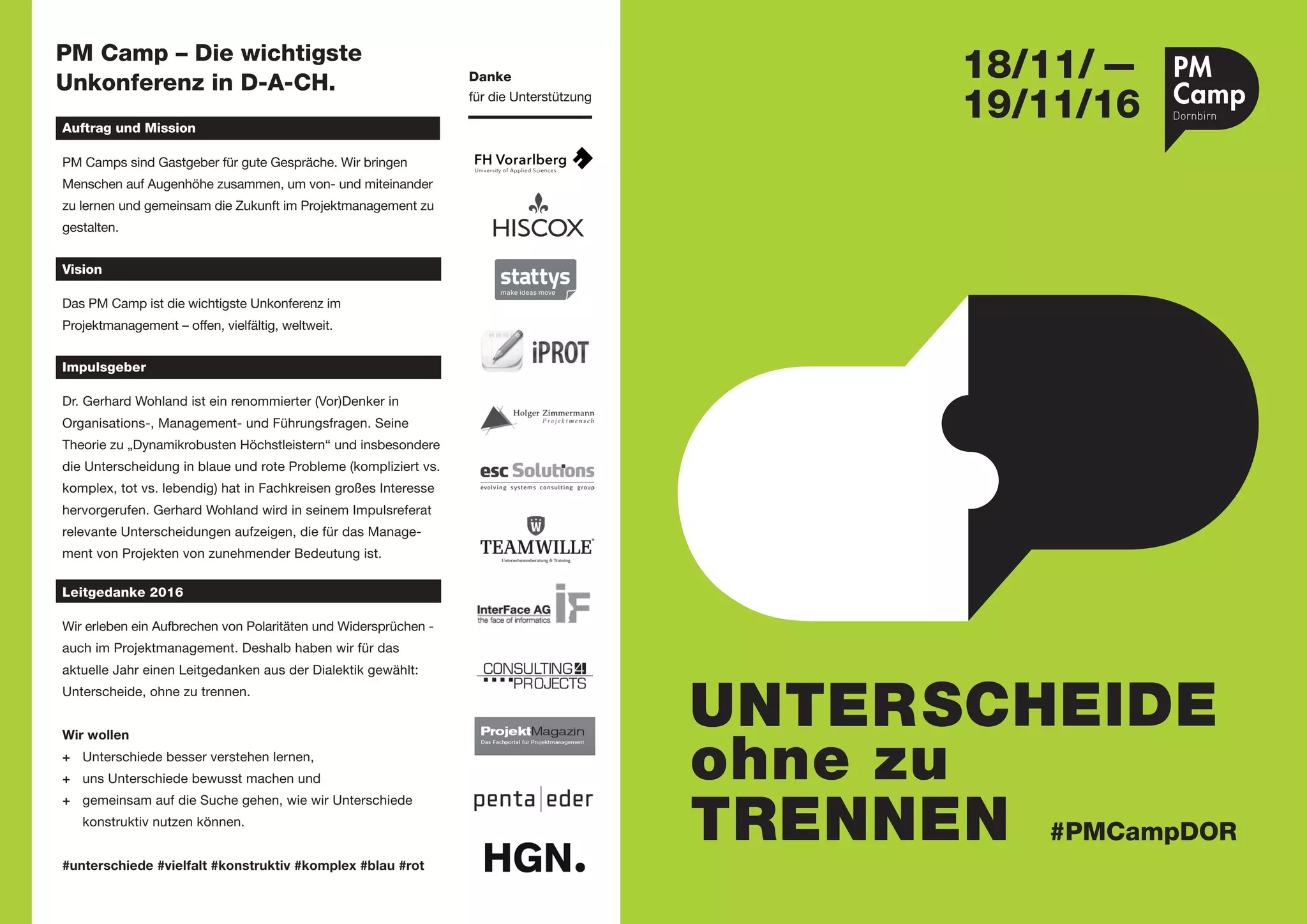 Das PM Camp, eine wichtige Unkonferenz im Projektmanagement, wurde am 18. und 19. November 2016 veranstaltet, um Menschen zusammenzubringen und den Austausch sowie das Lernen zu fördern. Dr. Gerhard Wohland hielt einen Impulsreferat über relevante Unterscheidungen im Management und die Herausforderungen im Projektmanagement, die sich aus konzeptionellen Polaritäten ergeben. Der Leitgedanke des Camps fokussierte sich auf das Verständnis und die konstruktive Nutzung von Unterschieden im Projektmanagement.