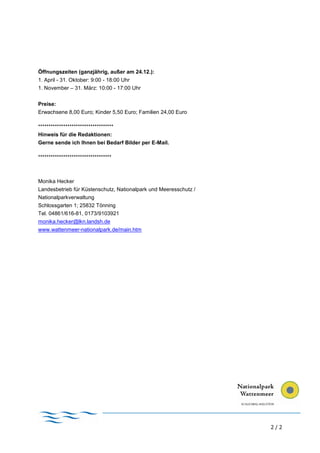 Im Nationalpark-Zentrum Multimar Wattforum in Tönning finden bis Ende Oktober jeden Montag und Freitag um 14:00 Uhr Fischfütterungen im Großaquarium statt, bei denen Taucher Fragen der Gäste beantworten. Die neue Taucherin Marén Boekamp hat zudem einen Handstandtest mit den Zuschauern eingeführt, während spezielle Fütterungen für bestimmte Fischarten durchgeführt werden. Weitere Informationen zu den Öffnungszeiten und Preisen sind auf der Webseite zu finden.
