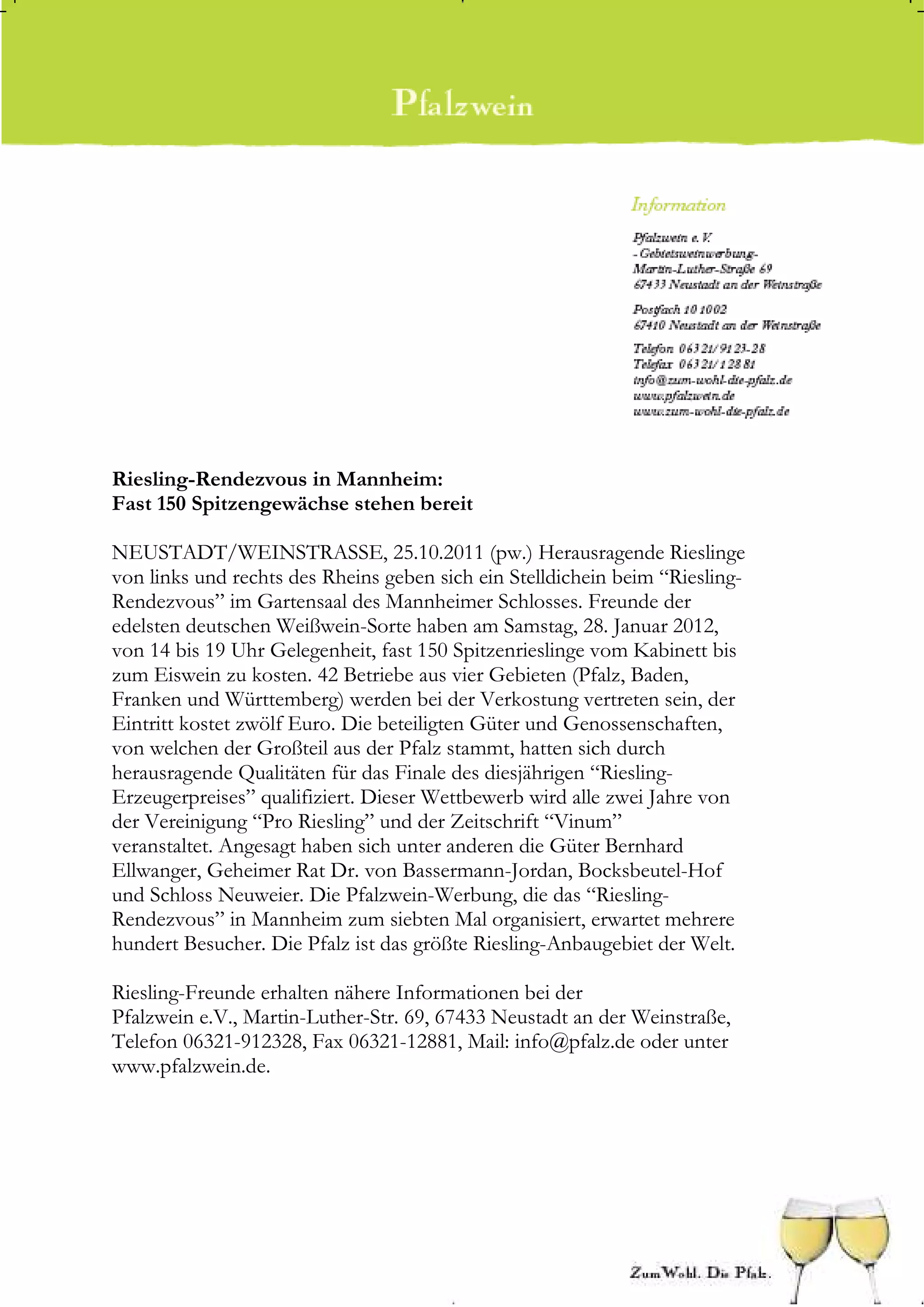 Am 28. Januar 2012 findet im Gartensaal des Mannheimer Schlosses das 'Riesling-Rendezvous' statt, bei dem Besucher fast 150 Spitzenrieslinge von 42 Betrieben aus der Pfalz, Baden, Franken und Württemberg kosten können. Der Eintritt beträgt zwölf Euro, und die Veranstaltung wird von der Pfalzwein-Werbung organisiert, die auf mehrere hundert Besucher hofft. Das Event ist Teil des alle zwei Jahre stattfindenden Wettbewerbs 'Riesling-Erzeugerpreis', der sich an herausragende Weinerzeuger richtet.