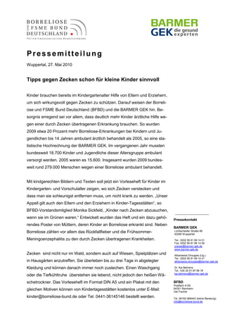 Eine Pressemitteilung vom 27. Mai 2010 betont die Wichtigkeit des Zeckenschutzes für Kinder im Kindergartenalter und weist darauf hin, dass die Zahl der Borreliose-Fälle unter Kindern zugenommen hat. Im Jahr 2009 wurden 18.700 Kinder und Jugendliche ambulant wegen Zeckenbissen behandelt. Der Borreliose- und FSME-Bund Deutschland sowie die Barmer GEK haben ein Vorleseheft entwickelt, um Kinder und deren Betreuer über die Gefahren von Zecken aufzuklären.