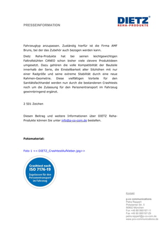 Die faltrollstühle caneo_b, _e und _s von Dietz Reha-Produkte haben den Crashtest gemäß ISO 7176-19 bestanden und sind somit für den Personentransport im Fahrzeug zugelassen. Dieses Sicherheitssystem umfasst ein Drei-Punkt-Begurtungssystem und spezielle Befestigungsteile, die für einen sicheren Transport notwendig sind. Dietz Reha-Produkte ist bekannt für innovative Lösungen in der Rehabilitationstechnik und hat weiterhin Wachstum und Erfolg im Markt.