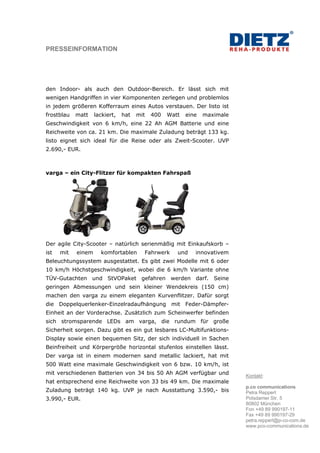 Dietz Reha-Produkte präsentiert auf der Rehacare 2012 in Düsseldorf eine neue Generation von Bechle Hochleistungs-Scootern, die von Mini- bis Maxivarianten reichen und Mobilität sowie Komfort bieten. Zu den Modellen gehören der kompakte Listo, der agile Varga und der premium Tifan, die jeweils unterschiedliche Geschwindigkeiten, Reichweiten und Ausstattungen bieten. Das Unternehmen ist bekannt für seine qualitativ hochwertigen Produkte in der Rehabilitation und Pflege und hebt sich durch technische Innovationen hervor.