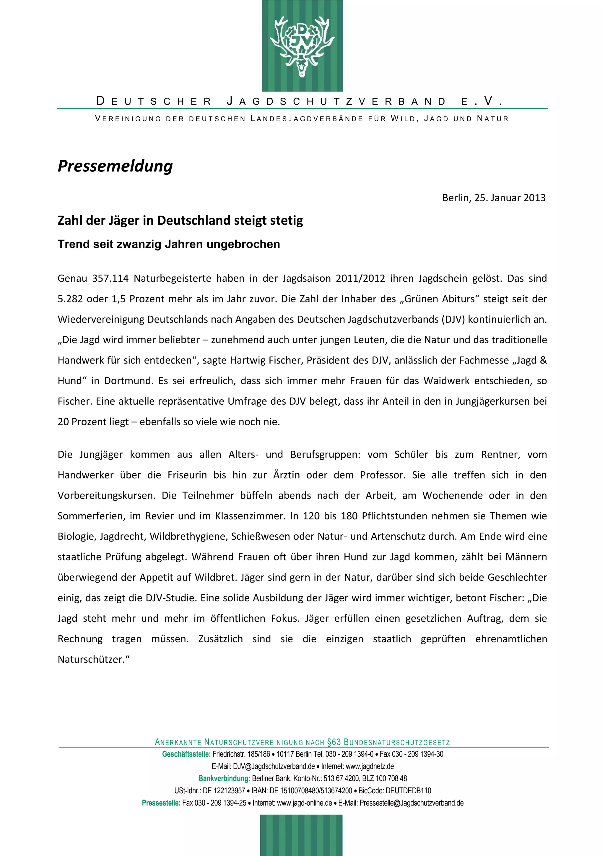 Die Zahl der Jäger in Deutschland ist mit 357.114 im Jahr 2011/2012 gestiegen, was einen Anstieg von 1,5 Prozent im Vergleich zum Vorjahr darstellt. Besonders erfreulich ist der wachsende Anteil junger Leute und Frauen an den Jungjägerkursen, die nun 20 Prozent ausmachen. Die Ausbildung der Jäger wird zunehmend wichtiger, da sie eine verantwortungsvolle Rolle im Naturschutz übernehmen.