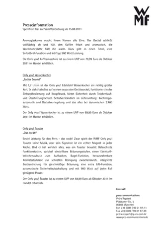 WMF präsentiert die 'Only You!' Elvis Presley Edition, ein Frühstücksset im Stil des American Diner aus den 50er und 60er Jahren, bestehend aus einer Kaffeemaschine, einem Wasserkocher und einem Toaster, alles in Rot und Edelstahl gehalten. Die Produkte sind ab Oktober 2011 erhältlich, wobei die Kaffeemaschine für 79,99 Euro, der Wasserkocher für 69,99 Euro und der Toaster ebenfalls für 69,99 Euro angeboten werden. WMF zielt darauf ab, mit diesem Set den Mythos Elvis Presley in die Küche zu bringen und verbindet dies mit umfangreicher Marketing- und Entertainment-Aktivitäten.