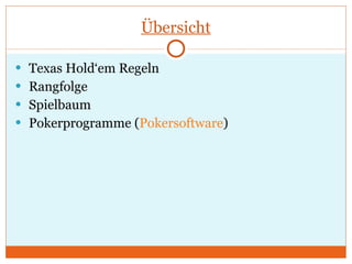 Das Dokument beschreibt die grundlegenden Regeln und Strategien für Texas Hold'em Poker, einschließlich der Wettmöglichkeiten und der Rangfolge der Pokerhände. Zudem wird die Bedeutung von Poker-Software hervorgehoben, die Spielern hilft, ihre eigenen Statistiken zu verfolgen und die ihrer Gegner zu analysieren, um ihre Spielstrategien zu verbessern. Abschließend wird auf die verschiedenen Arten von Software eingegangen, die das Pokerspiel sowohl im Wettkampf als auch im Training unterstützen können.