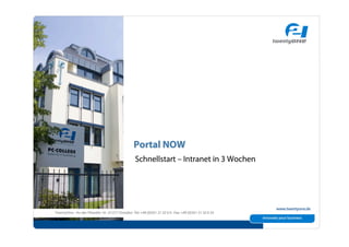 Das Dokument beschreibt das IBM WebSphere Portal mit dem Fokus auf 'Portal Now', das einen schnellen Start und schrittweisen Ausbau von Funktionen wie Dashboards, Blogs und RSS-Feeds ermöglicht. Es hebt die Vorteile einer benutzerfreundlichen Web-Präsenz hervor, die die interne Kommunikation verbessert und die Produktivität der Mitarbeiter steigert, während es gleichzeitig eine einfache Integration von Anwendungen und Prozessen bietet. Darüber hinaus werden konkrete Implementierungsschritte und Zeitrahmen für die Installation und Konfiguration des Portals bereitgestellt.