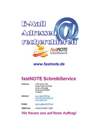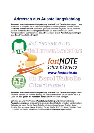 Der Fastnote Schreibservice bietet seit über 20 Jahren umfassende Dienstleistungen zur Adressrecherche und -eingabe in Excel-Tabellen, einschließlich der Übertragung von Kontaktdaten aus verschiedenen Quellen wie Ausstellungskatalogen, Hotelführern und Online-Katalogen. Kunden können ihre Vorlagen per Post oder als PDF einsenden, während das Team von Fastnote die Daten sorgfältig einträgt und optimiert, um Postrückläufer zu minimieren. Weitere Informationen und Beratung sind über ihre Website oder per E-Mail verfügbar.