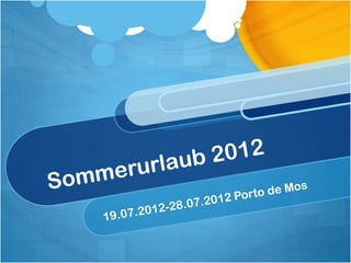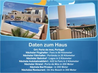 Das Dokument enthält Informationen zu einem Haus in Porto de Mós, Portugal, einschließlich der nächsten Verkehrsverbindungen und Entfernungen zu Einrichtungen wie Strand, Bars und Restaurants. Es bietet auch eine Kostenübersicht pro Person, die Gesamtpreise für Hausmiete, Kaution, Flug, Mietwagen, Spritkosten, Verpflegung und Taschengeld umfasst. Die gesamte geschätzte Kostenaufstellung beläuft sich auf 9.120 €.