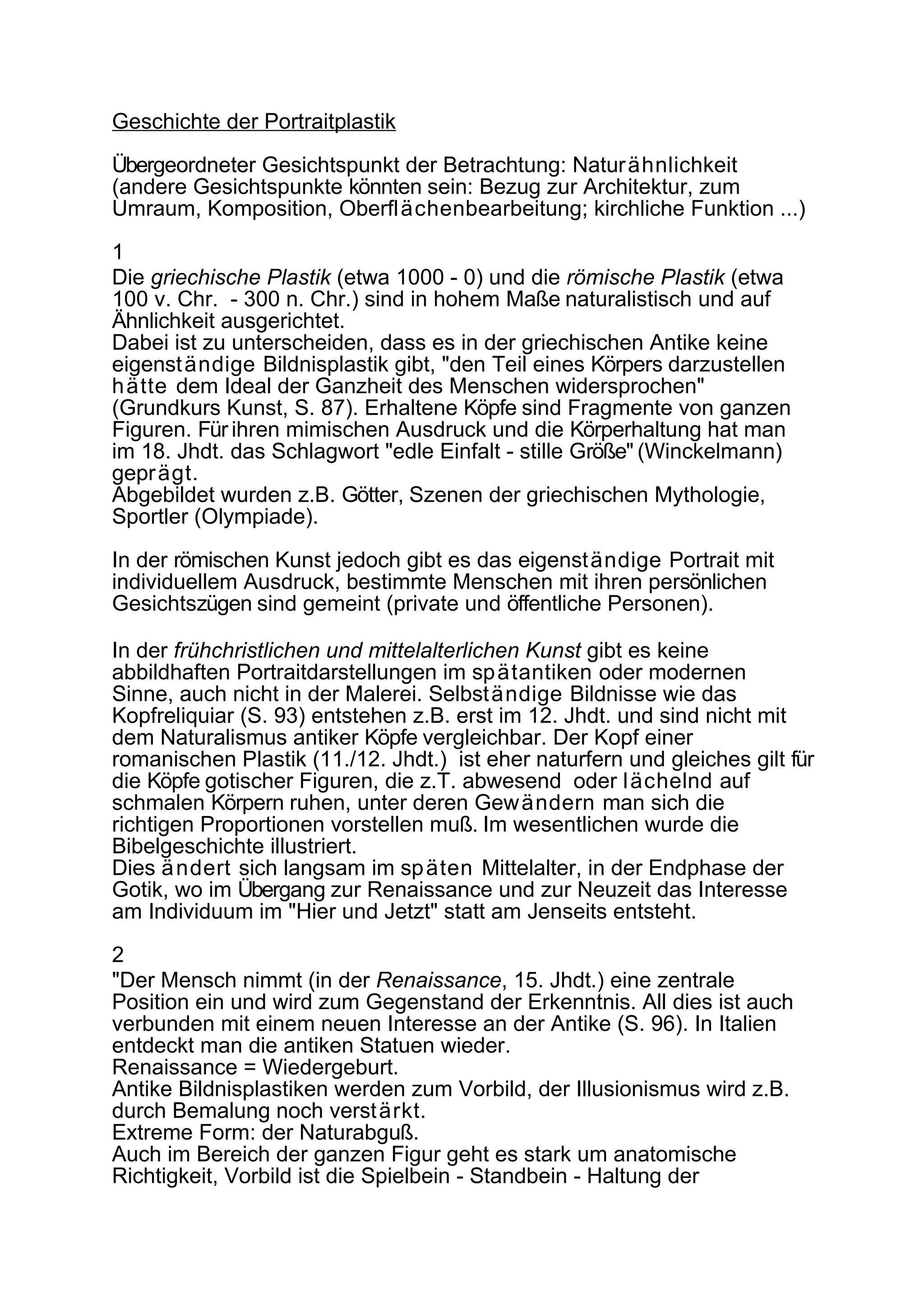 Die Geschichte der Portraitplastik zeigt eine Entwicklung von der naturalistischen griechischen und römischen Kunst über die idealisierten Darstellungen der Renaissance und den dynamischen Barock zu den abstrakten Formen der modernen und zeitgenössischen Kunst. Während die antiken Plastiken vor allem Idealtypen darstellten, begann die Kunst im späten Mittelalter und in der Renaissance, das Individuum und dessen Ausdruck in den Vordergrund zu rücken. Im 20. Jahrhundert nahm die Abstraktion zu, wobei die Kunst zunehmend von persönlichen Experimenten und neuen Formen geprägt wurde.