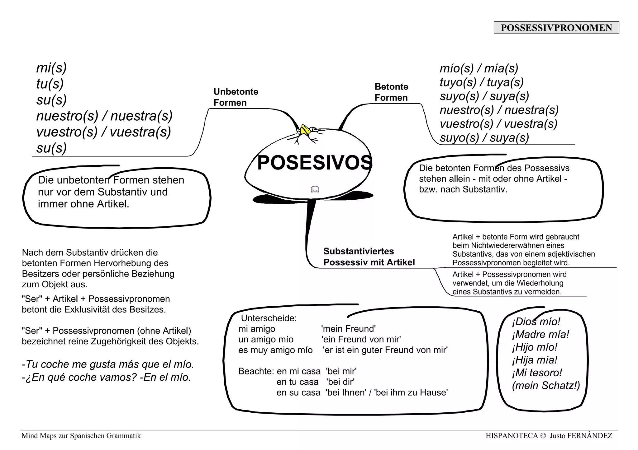 Das Dokument beschreibt die Verwendung von Possessivpronomen im Spanischen, einschließlich betonter und unbetonter Formen. Es erläutert die Stellung der Pronomen in Bezug auf Substantive und deren Einsatz zur Vermeidung von Wiederholungen. Zudem werden Beispiele für den Gebrauch der Pronomen in verschiedenen Kontexten gegeben.