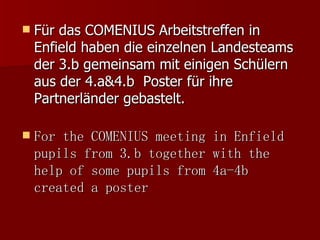 Für das Comenius-Arbeitstreffen in Enfield haben die Landesteams der Klassen 3.b und einige Schüler der Klassen 4.a und 4.b gemeinsam Poster zu ihren Partnerländern erstellt. Die Schüler haben verschiedene Schritte durchlaufen, um die Inhalte zu planen und die Poster zu gestalten, wobei der Fokus auf Vielfalt gelegt wurde. Die Ergebnisse werden beim Treffen in Enfield präsentiert und sind später einsehbar.