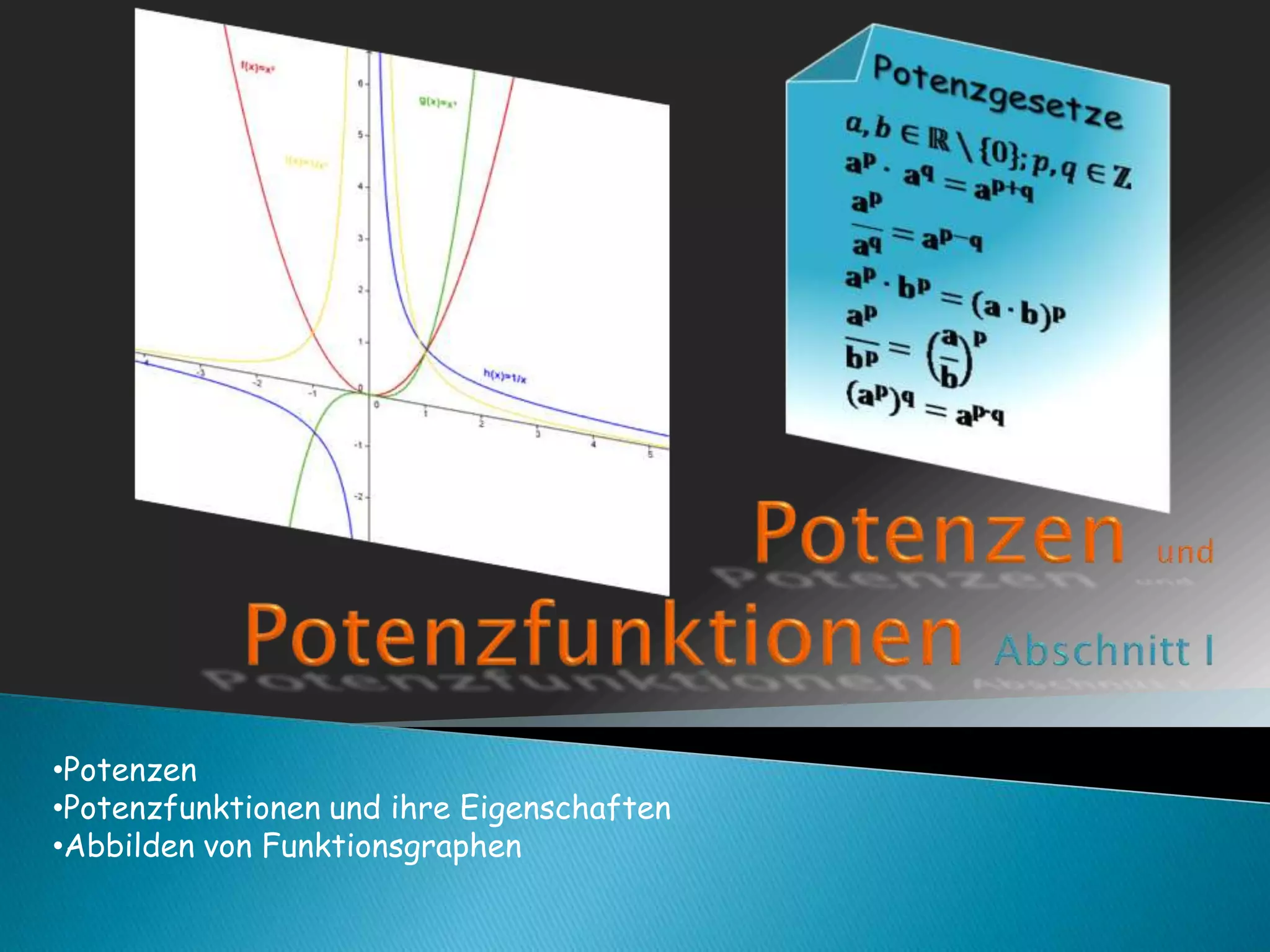 Das Dokument behandelt Potenzen und Potenzfunktionen sowie deren Eigenschaften und Zusammenhänge, insbesondere im Kontext von Funktionsgraphen. Es wird erläutert, wie Gleichungen der Form gelöst werden können und welche Potenzgesetze dabei zu beachten sind. Zudem werden spezielle Fälle wie lineare und quadratische Funktionen behandelt.