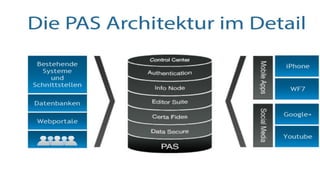 Das Dokument beschreibt den Power Application Server (PAS), eine Multi-Channel-Plattform, die Unternehmen ermöglicht, ihre Kommunikationsinhalte über verschiedene digitale Kanäle effizient zu verwalten und zu veröffentlichen. Die Plattform optimiert den Prozess der Inhaltserstellung und -verteilung, reduziert den Zeitaufwand um bis zu 70% und integriert bestehende Systeme, um eine nahtlose Kommunikation mit Kunden zu gewährleisten. PAS bietet benutzerfreundliche Oberflächen, ermöglicht die Veröffentlichung auf verschiedenen Geräten und Kanälen, und gewährleistet eine hohe Flexibilität durch cloudbasiertes Arbeiten.