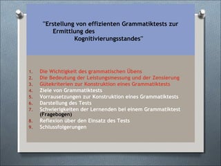 Athanassios D. Groudos, ein Germanistik-Student an der Aristoteles-Universität in Thessaloniki, behandelt in seiner Diplomarbeit das Thema der Erstellung effizienter Grammatiktests zur Ermittlung des Kognitivierungsstandes von Schülern. Die Arbeit thematisiert unter anderem die Bedeutung des grammatischen Übens, die Entwicklung von Leistungsmessungen und die Gütekriterien zur Konstruktion von Tests. Ziel ist es, eine Methode zu entwickeln, die den Lernenden hilft, ihre Grammatikfähigkeiten in realen Kommunikationssituationen anzuwenden und somit den Lernfortschritt bei der deutschen Sprache zu fördern.