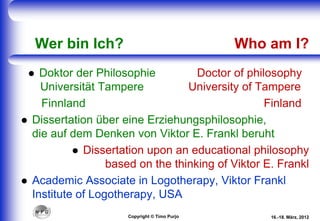 Das Dokument behandelt die kritischen Grundbegriffe der Logotherapie nach Viktor Frankl, insbesondere den Sinnbegriff, der auf Wertbezogenheit und Selbsttranszendenz basiert. Es wird diskutiert, wie Sinnmöglichkeiten in universellen Werten wie Güte, Gerechtigkeit, Schönheit und Wahrheit gefunden werden können. Die sinnvolle Handlung wird als diejenige definiert, die über das Individuum hinausweist und sich an universalen Werten orientiert.