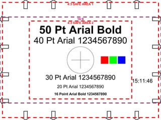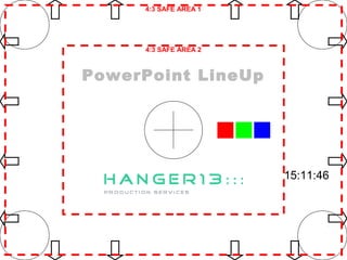 Das Dokument enthält technische Informationen über verschiedene Format- und Auflösungsbereiche für Präsentationen, einschließlich Safe Areas für 4:3 und 16:9, sowie Details zu Schriftarten und Testelementen. Es listet auch spezifische Tests von Audio- und Videoquellen auf, sowie Anweisungen zur Anpassung der Lautstärke und Darstellungstechniken. Die Inhalte scheinen für technische Präsentationen und Tests von audiovisuellem Equipment vorgesehen zu sein.