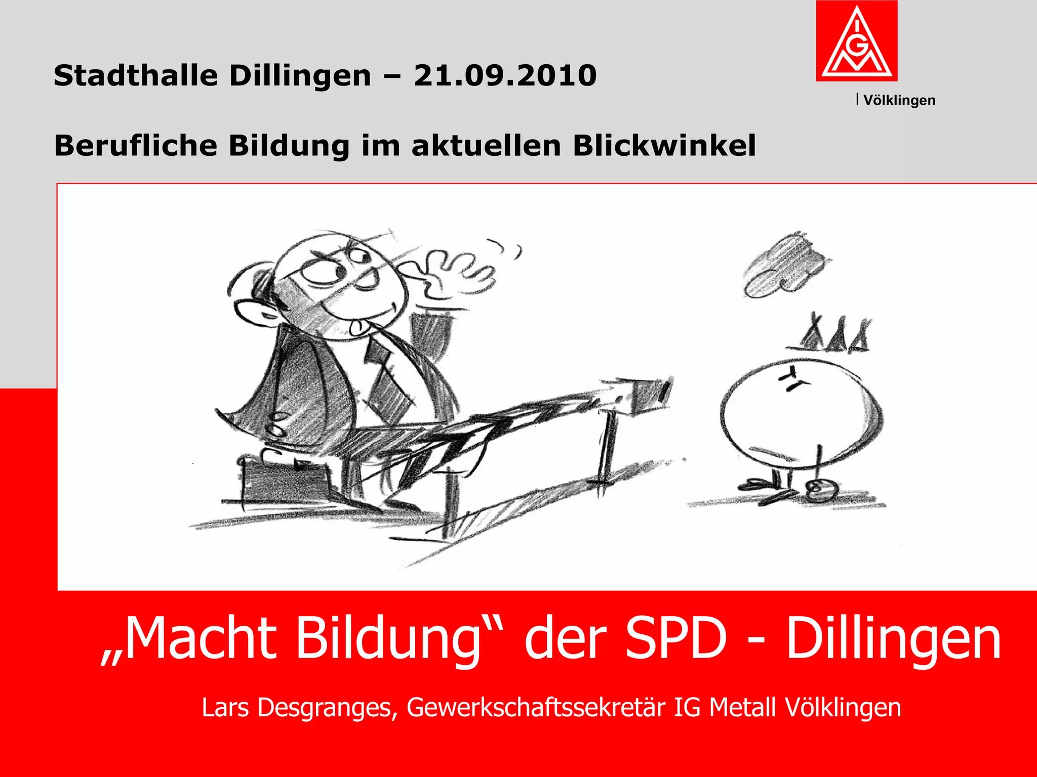Die Veranstaltung 'Macht Bildung' der SPD in Dillingen thematisierte die berufliche Bildung, präsentiert von Lars Desgranges von der IG Metall Völklingen. Die IG Metall Völklingen verzeichnete im August 2010 insgesamt 27.323 Mitglieder, darunter 2.882 Jugendliche und 980 Azubis, und stellte verschiedene Ausbildungsbetriebe in der Region vor. Großbetriebe wie Ford, Saarstahl und Dillinger Hütte bilden Hunderte von Azubis jährlich aus.