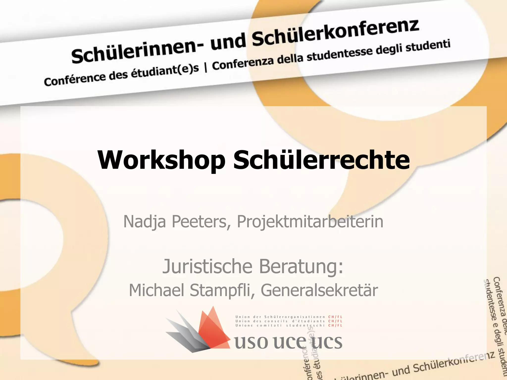 Der Workshop behandelt die Rechte von Schülerinnen und Schülern im Schweizer Bildungssystem, einschließlich der gesetzlichen Hierarchie und der Rekursmöglichkeiten. Es wird erläutert, dass die Weisungsbefugnis von Lehrpersonen auf das Schulareal, die Schulzeit und den schulischen Zweck beschränkt ist. Zudem werden die verschiedenen Ebenen der Gesetzgebung von der Bundesverfassung bis zu den Gemeindeverordnungen dargestellt.