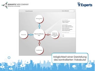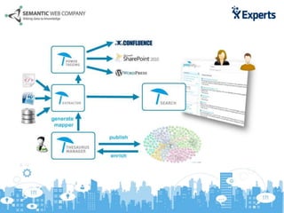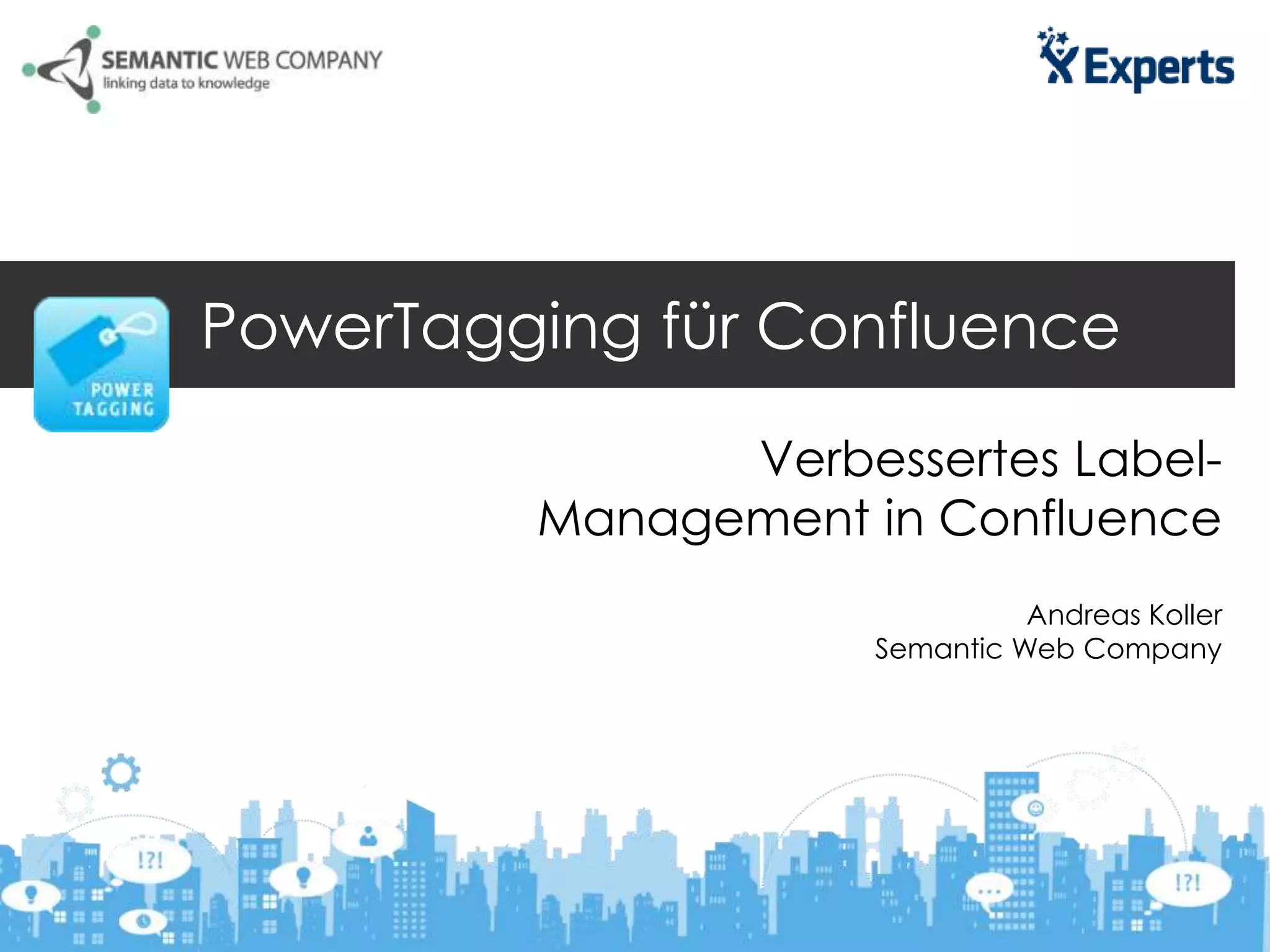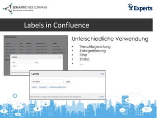Das Dokument beschreibt die Herausforderungen und Lösungen im Label-Management innerhalb von Confluence, insbesondere das manuelle Setzen von Labels zur Verbesserung der Suche. Die vorgeschlagene Lösung, Poolparty Powertagging, ermöglicht automatisiertes Tagging und synonymische Verknüpfungen, was zur Reduktion von Suchzeiten und verbesserten Suchmöglichkeiten führt. Zudem werden Nutzungsszenarien wie HR-Management und FAQ-Management vorgestellt, um die Vorteile des Systems zu veranschaulichen.