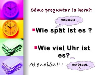El documento enseña cómo preguntar y expresar la hora en alemán, incluyendo frases clave y estructuras para diferentes momentos del día. También se explican las diferencias en la manera de decir la hora respecto al inglés y se proporcionan ejemplos prácticos para uso cotidiano. Además, se abordan los formatos digitales de hora y la importancia de entender el contexto al preguntar sobre el tiempo.
