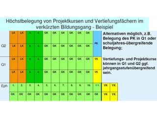 Das Dokument beschreibt die Struktur und Anforderungen der gymnasialen Oberstufe im achtjährigen Bildungsgang, einschließlich der Kursbelegung, Abiturprüfungen und der Notenvergabe in den verschiedenen Phasen der Schulausbildung. Es behandelt spezifische Fächer und Aufgabengebiete, Vertiefungsfächer sowie die Bedingungen zur Versetzung und zur Wahl der Abiturfächer. Zudem werden verschiedene Projektkurse und Beispiele für Schullaufbahnen aufgeführt.
