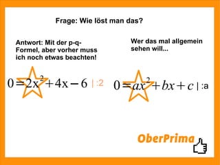 Das Dokument erklärt, wie man die Nullstellen einer quadratischen Funktion mithilfe der p-q-Formel findet und hebt hervor, dass es alternative Methoden zur Lösung gibt. Es wird empfohlen, die Webseite www.mathe-fa.de/de zu besuchen, um Funktionsgrafen zu analysieren und die berechneten Ergebnisse zu überprüfen. Für weitere Informationen wird angeboten, persönlichen Kontakt aufzunehmen, um das Verständnis zu vertiefen.